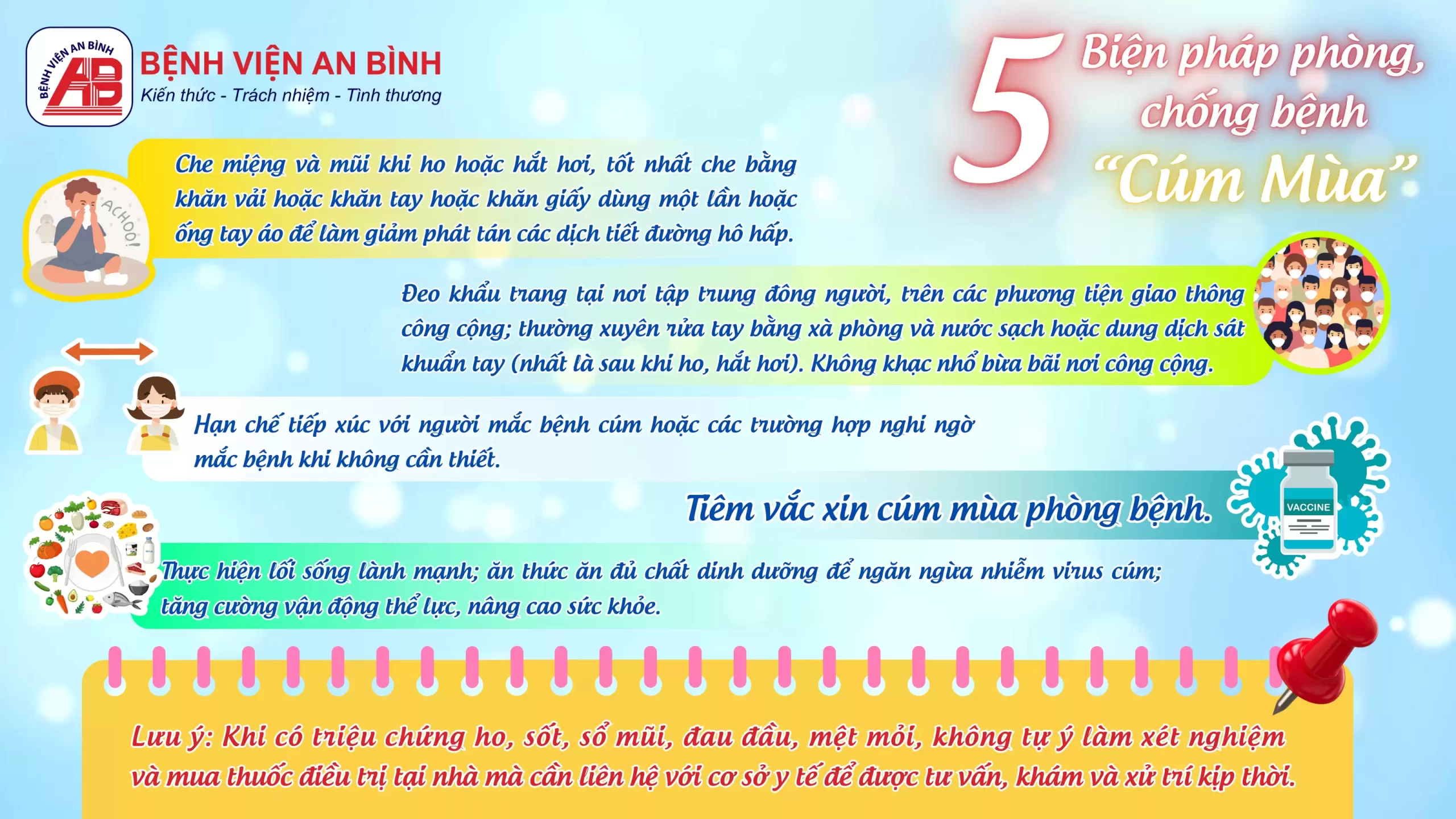 Lưu ý: Khi có triệu chứng ho, sốt, sổ mũi, đau đầu, mệt mỏi, không tự ý làm xét nghiệm và mua thuốc điều trị tại nhà mà cần liên hệ với cơ sở y tế để được tư vấn, khám và xử trí kịp thời.