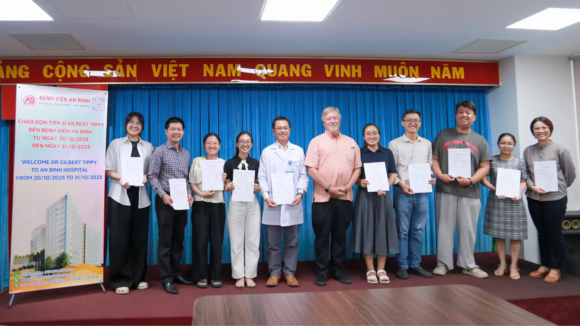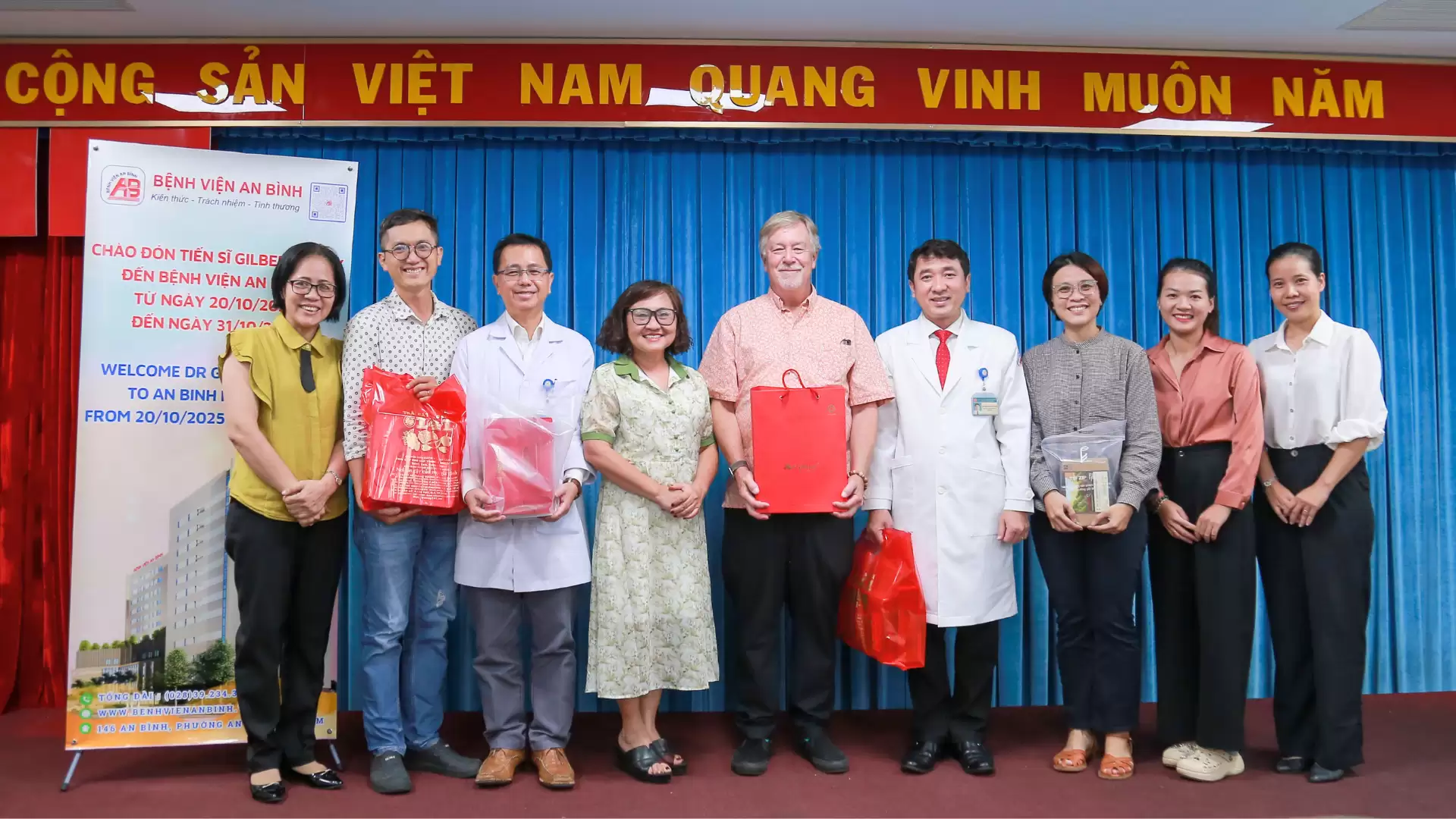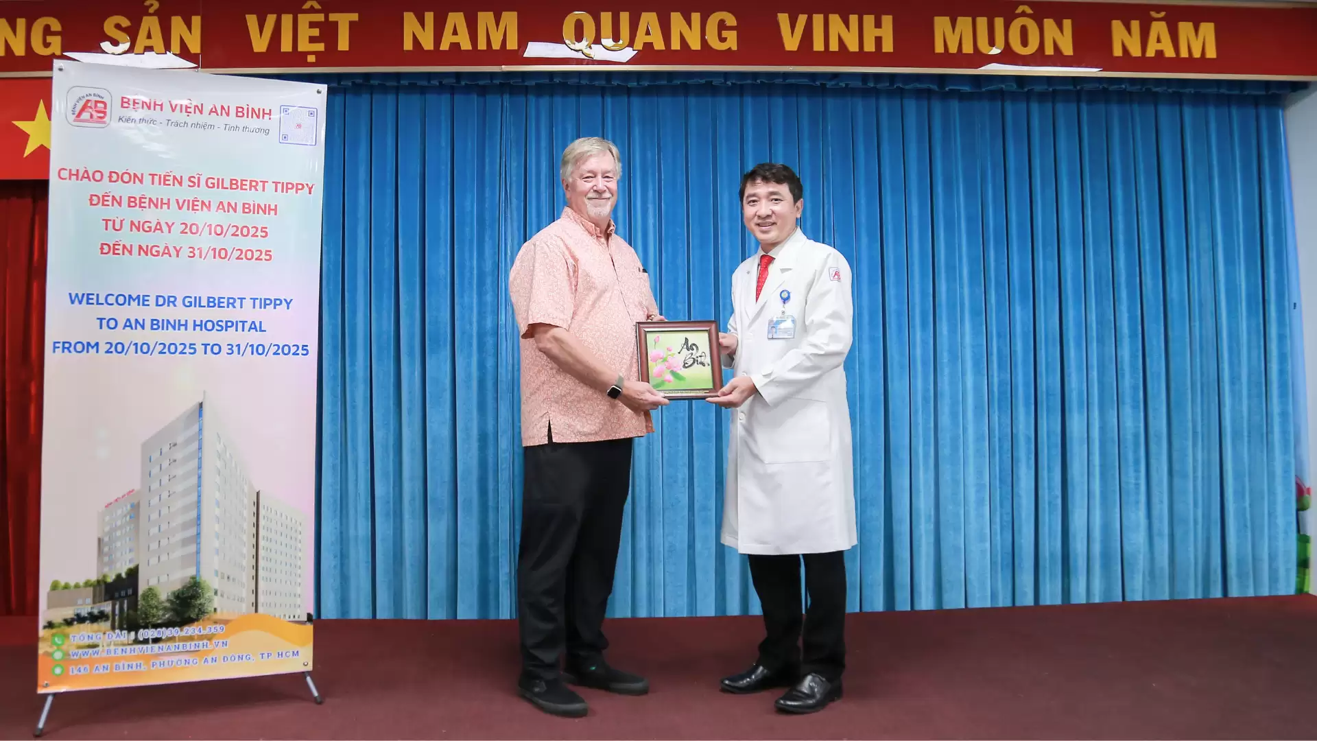 •Bệnh viện An Bình cũng gửi tặng quà lưu niệm đến Giáo sư Gilbert Tippy, thể hiện lòng tri ân sâu sắc vì những đóng góp quý báu, tạo điều kiện để hoạt động này diễn ra thành công.