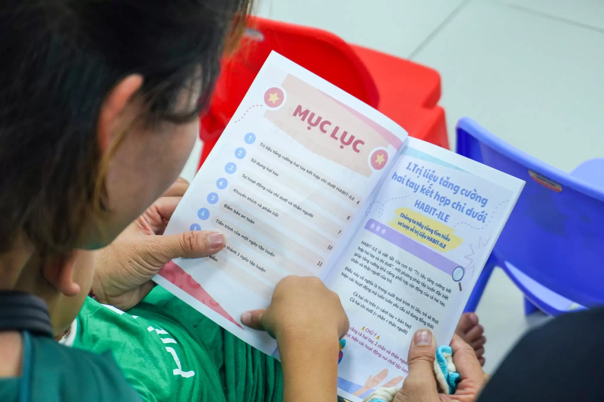 Đồng thời, các bậc phụ huynh được hướng dẫn cụ thể cách áp dụng chương trình tập luyện tại nhà, góp phần duy trì và kéo dài hiệu quả phục hồi sau thời gian can thiệp tập trung tại bệnh viện.
