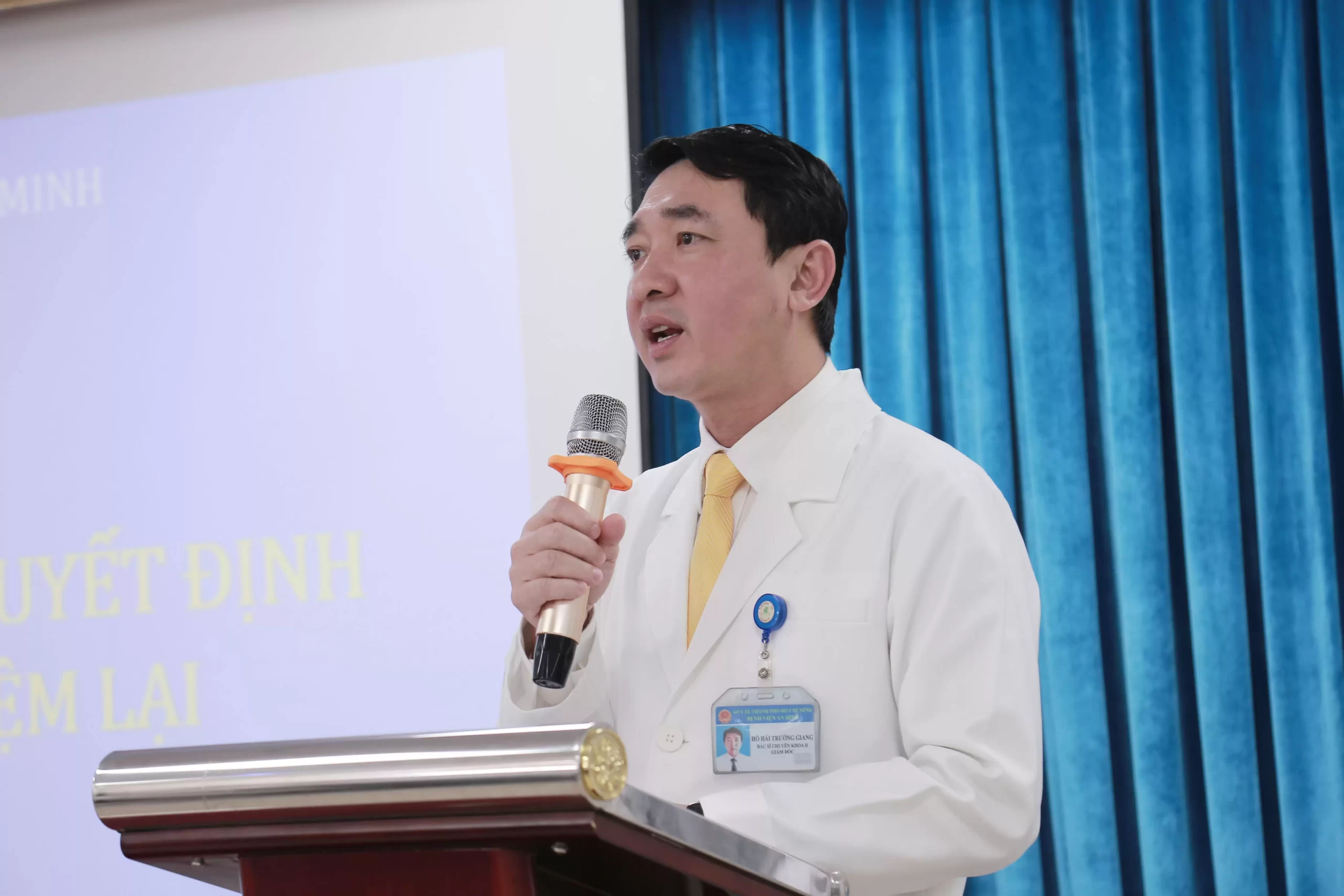 Phát biểu chỉ đạo tại buổi lễ, BS CKII. Hồ Hải Trường Giang, Giám đốc Bệnh viện đã nhấn mạnh tầm quan trọng của công tác kiện toàn nhân sự lãnh đạo, quản lý trong việc nâng cao hiệu quả chuyên môn và phát triển bền vững của Bệnh viện. Đồng thời Giám đốc Bệnh viện đề nghị các nhân sự được bổ nhiệm, bổ nhiệm lại tiếp tục phát huy năng lực quản lý, chuyên môn nghiệp vụ, kết hợp với cơ sở vật chất hiện đại triển khai nhiều kỹ thuật mới, chất lượng cao, đồng thời phối hợp tốt với các khoa, phòng nhằm nâng cao chất lượng, hiệu quả khám, chữa bệnh của Bệnh viện, mang đến sự hài lòng cho người dân.
