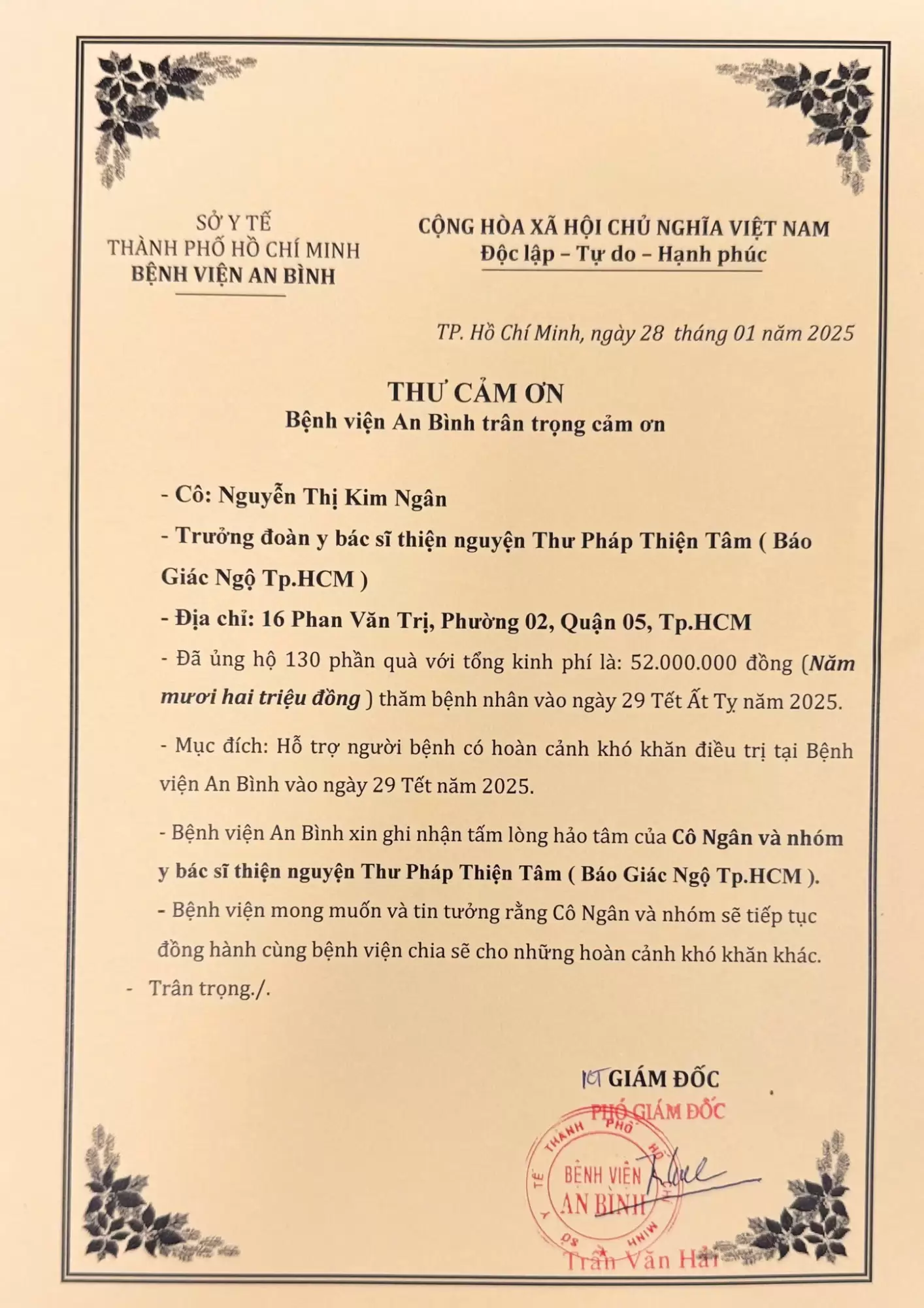 – Mục đích: Hỗ trợ người bệnh có hoàn cảnh khó khăn điều trị tại Bệnh viện An Bình vào ngày 29 Tết năm 2025.