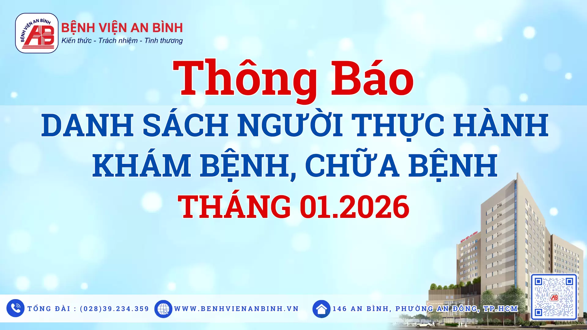 Danh sách người thực hành khám bệnh, chữa bệnh tháng 01 năm 2026 Danh sách người thực hành khám bệnh, chữa bệnh tháng 01 năm 2026 Danh sách Người hoàn thành quá trình thực hành khám bệnh, chữa bệnh tại Bệnh viện An Bình
