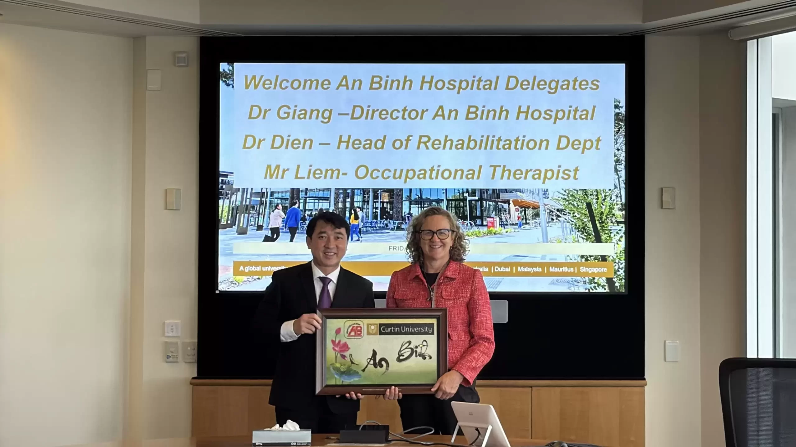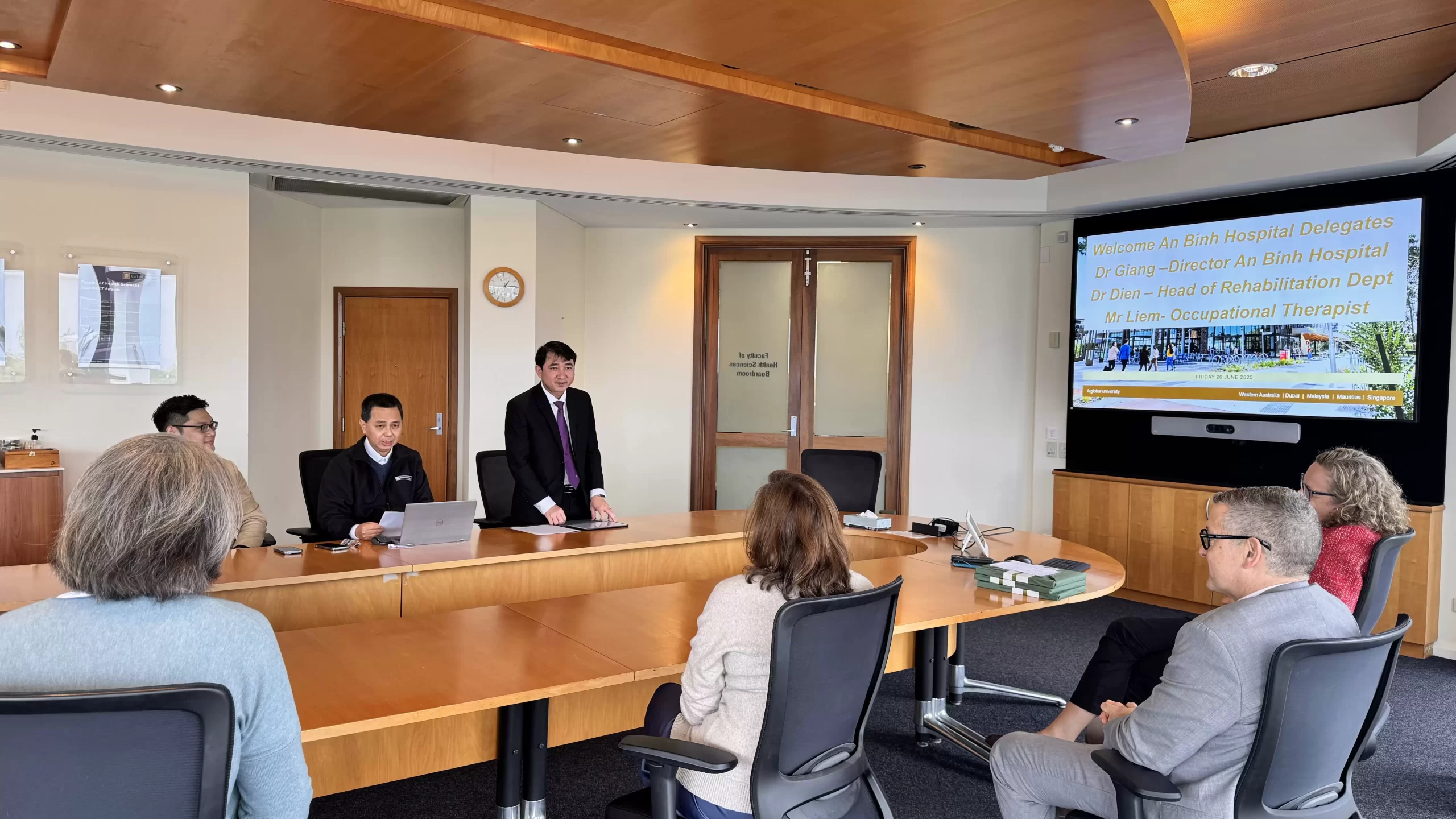 Ngoài ra, đoàn còn có buổi làm việc với lãnh đạo Đại học Curtin và Viện Nghiên cứu Y khoa Harry Perkins về chiến lược hợp tác dài hạn. Hai bên thống nhất bước đầu triển khai chương trình hợp tác phát triển phục hồi chức năng cho bệnh nhân sau đột quỵ, kết hợp lâm sàng và nghiên cứu giữa Đại học Curtin và Bệnh viện An Bình, đặt nền móng cho các dự án chuyên sâu trong tương lai.