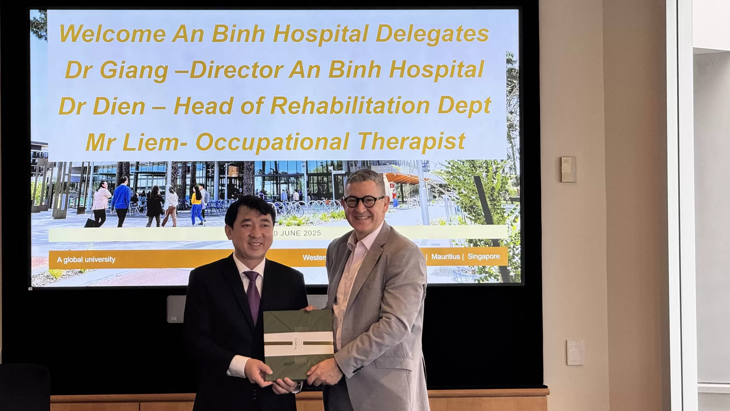 Để cụ thể hóa mối quan hệ hợp tác, trong hai ngày 17–18/6/2025, đoàn công tác Bệnh viện An Bình đã đến thăm và làm việc với Đại học Curtin và các bệnh viện lớn hàng đầu ở Bang Tây Úc như: Bệnh viện Nhi đồng Perth, Bệnh viện Fiona Stanley; cơ sở Phục hồi chức năng thần kinh Brightwater Oats Street; Viện nghiên cứu Y khoa Harry Perkins. Mục tiêu của chuyến đi là thúc đẩy hợp tác song phương, tìm hiểu mô hình phục hồi chức năng hiện đại qua đó nâng cao chất lượng chăm sóc y tế và chất lượng nguồn nhân lực tại bệnh viện An Bình.
