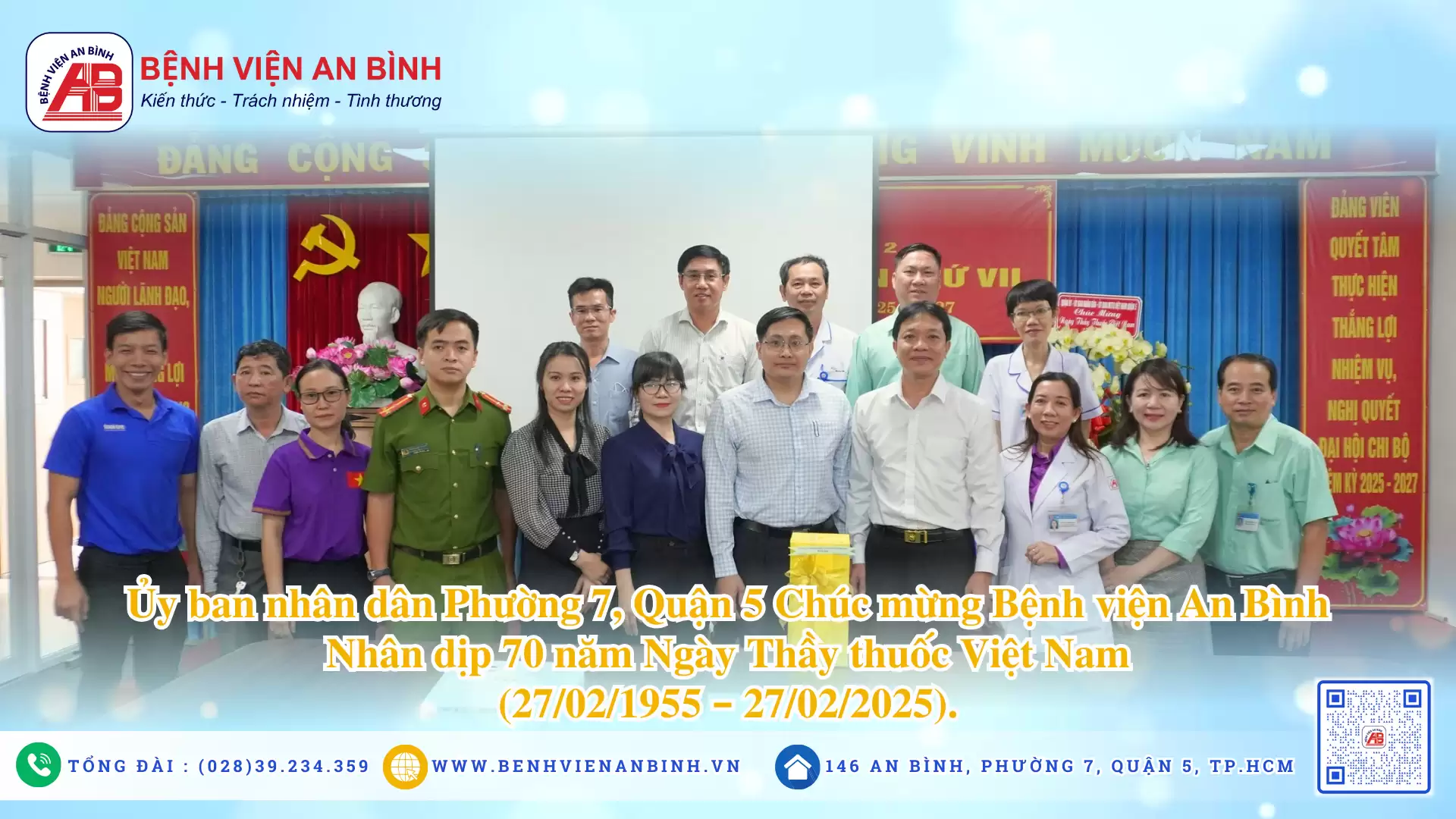 Nhân dịp kỷ niệm 70 năm Ngày Thầy thuốc Việt Nam (27/02/1955 – 27/02/2025), Ủy ban nhân dân Phường 7, Quận 5 gửi lời chúc mừng đến toàn thể đội ngũ y bác sĩ, cán bộ, nhân viên y tế của Bệnh viện An Bình.