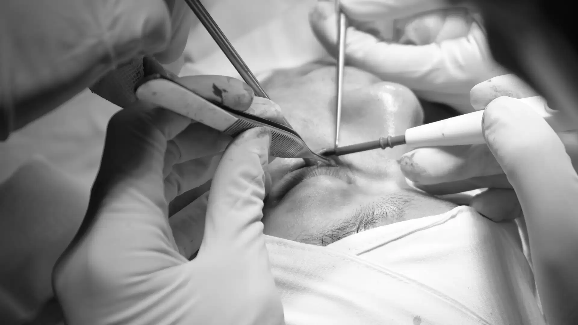 (Ở bệnh nhân đầu tiên, mặc dù phải mở đường rạch ngoài mặt qua nếp gấp mi dưới, Ekip đã áp dụng kỹ thuật khâu thẩm mỹ vi phẫu, đồng thời kết hợp xương bờ dưới ổ mắt bằng nẹp vít cỡ nhỏ.)