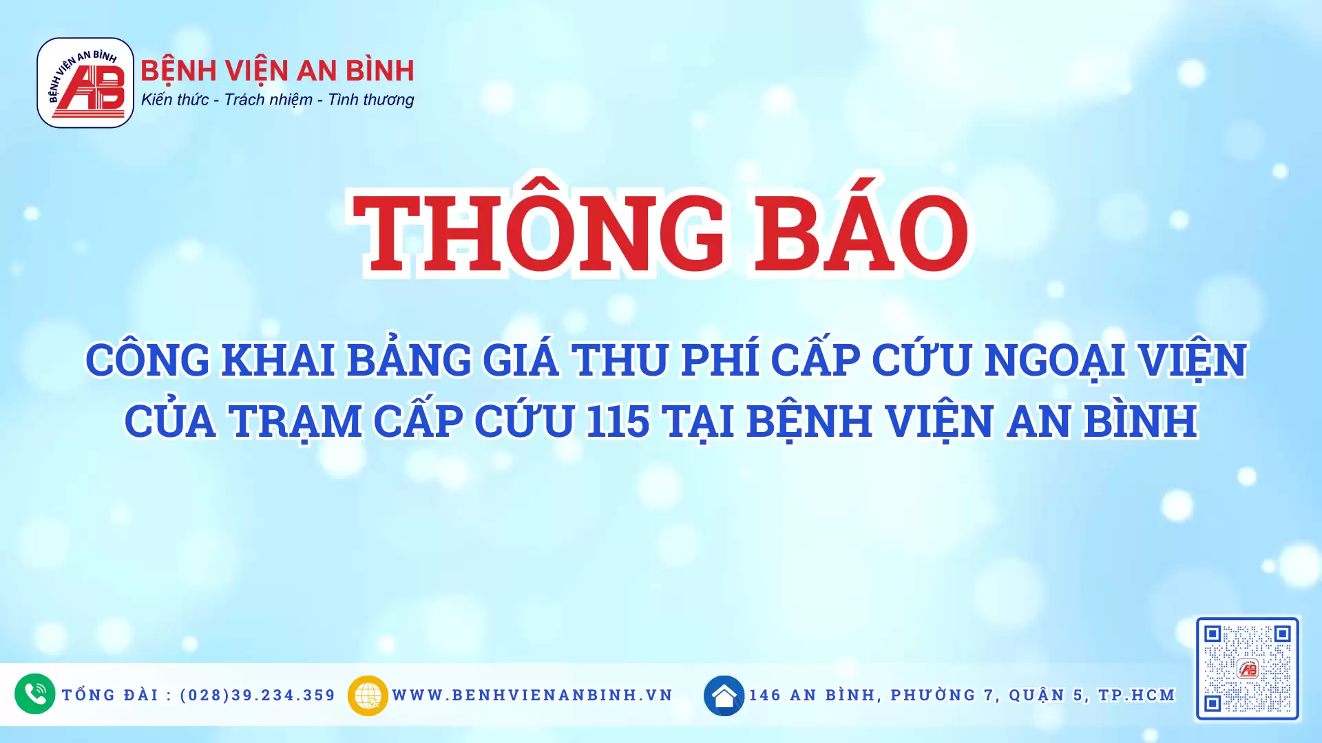 Thông báo công khai bảng giá thu phí cấp cứu ngoại viện của trạm cấp cứu 115 tại Bệnh viện An BìnhLIÊN KẾT TẢI VỀ: CÔNG KHAI BẢNG GIÁ THU PHÍ CẤP CỨU NGOẠI VIỆN CỦA TRẠM CẤP CỨU 115 TẠI BỆNH VIỆN AN BÌNH Hưởng ứng Ngày Thế giới phòng chống sốt rét – World Malaria Day (25/4/2025) 2 phút cùng Bác sĩ #52 – Điều trị thoái hóa khớp gối bằng phương pháp Tiêm Acid hyaluronic
