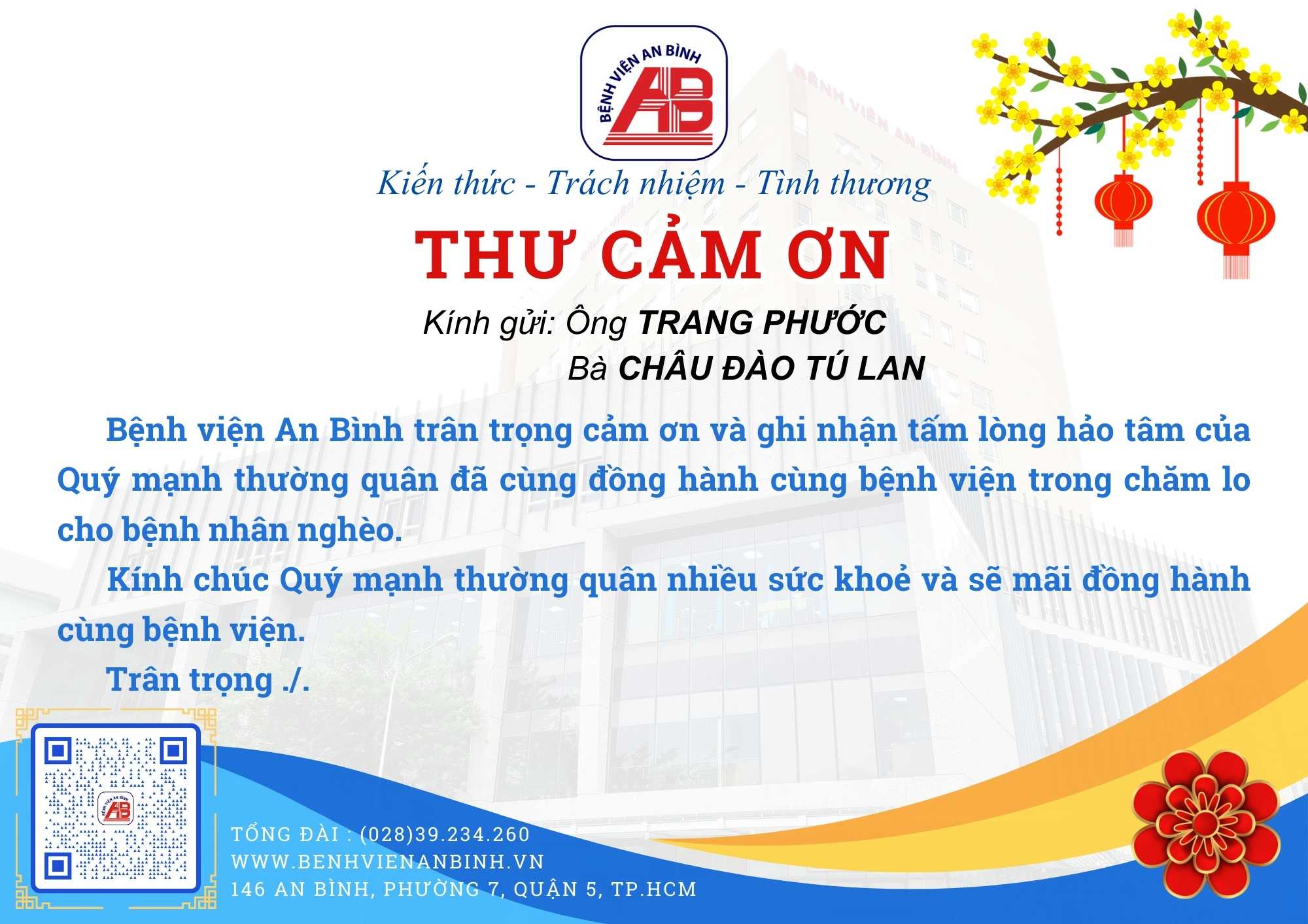 Thư cám ơn Ông Trang Phước – Bà Châu Đào Tú Lan THÔNG BÁO MỜI CHÀO GIÁ GÓI THẦU BẢO TRÌ VÀ THAY THẾ LINH KIÊN HỆ THỐNG VẬN CHUYỂN MẪU BỆNH PHẨM TỰ ĐỘNG NĂM 2024 Thư cảm ơn Nhóm Thiện Duyên
